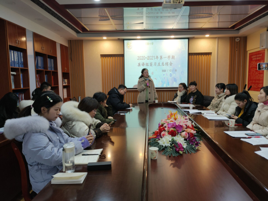 首先,石莹老师对我院实习生为期近四个月的实习情况进行了总体介绍,详细梳理了本学期实习生的工作内容,并对大家实习工作的表现给予了充分的肯定。在整个实习过程中,实习生们根据我校英语组制定的详细工作计划及实习要求,在有限的实习时间里,认真完成各项工作,在增强专业素养的同时也积累了教育教学一线的工作经验。