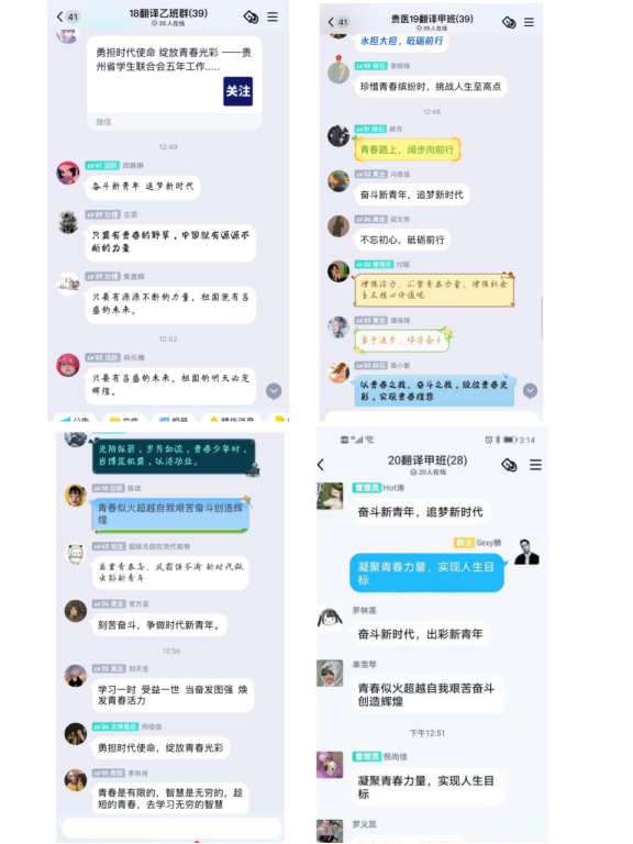 讨论会上,各班团支部书记领学省委书记谌贻琴同志致大会贺信、省委副书记蓝绍敏同志《在省青联第十一届委员会全体会议 省学联第九次代表大会上的讲话》等讲话精神。各班代表结合自身学习感悟和同学们做了交流,同学们纷纷表示作为新时代的新生动力,必定在第二个百年奋斗目标的新征程中坚定理想信念、培育高尚品格、在实现中华民族伟大复兴中国梦的进程中书写青春篇章。