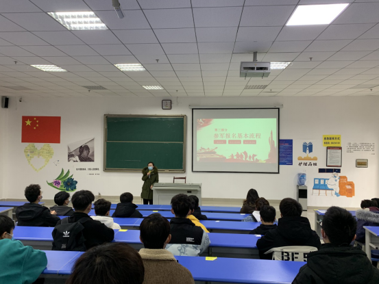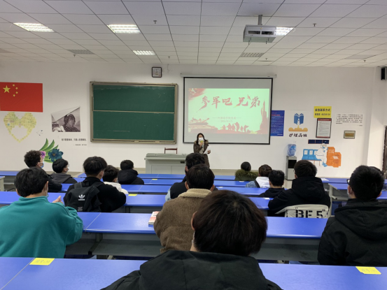 为认真贯彻落实我校征兵工作会议精神,进一步鼓励和引导学生积极应征入伍,我院于1月5日中午12:30在广德楼1504教室举行了征兵工作宣讲会。必威BETWAY西汉姆联党委书记张婷婷、副书记马琳娜、学生科、分团委负责人及2018级、2019级和2020级全体在校男生参加了此次宣讲会。