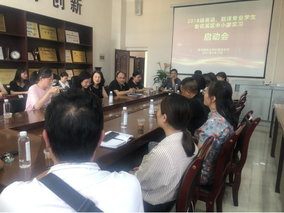 2021年9月10日下午2点,必威BETWAY西汉姆联组织2018级英语和翻译专业44名学生在必威BETWAY西汉姆联会议室开展了赴花溪区中小学实习启动会。出席此次会议的有花溪区教育局人事科李光伟科长和花溪区14所中小学负责人,以及外国语学院党委书记张婷婷、院长龙芸、党委副书记马琳娜、生产实习科黎文清、教学管理科冷凤老师也参加了会议。