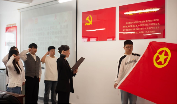 入团仪式在庄严的国歌声中拉开帷幕。仪式开始,主持人宣读新发展团员名单,付启宏、马琳娜为新团员们颁发团员证、佩戴团徽。