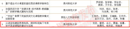 贵州省教育厅发布了2022年贵州省级“金课”认定名单,我院龙芸教授团队的“医学文献翻译”认定为社会实践类一流课程;李雨徽老师团队的“红色故事话你知”认定为线上一流课程。