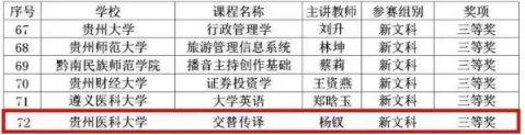 2023415日由贵州省教育厅主办的贵州省第三届高校教师教学创新大赛落幕,经过网络、现场评审,我院杨钗教师(团队)获得新文科类三等奖。