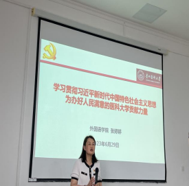 张婷婷以《学习贯彻习近平新时代中国特色社会主义思想 为办好人民满意的医科大学贡献力量》为题,围绕“学思想,强党性”“用习近平新时代中国特色社会主义思想武装头脑、指导实践”“坚持以习近平新时代中国特色社会主义思想为指导,优化大学英语教学、助力学校人才培养,为办好人民满意的医科大学贡献力量”三个部分,以“浦江经验”和“千万工程”的重要启示结合学院工作实际,对学院党员干部的理论学习、党性锻炼、实践推动发展方面进行了阐述。