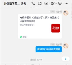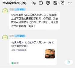 两个基层党支部在支部群中陆续推送《反复为了人民》全集让学院全体党员认真观看、学习,警醒广大党员要做到知敬畏、存戒惧、守底线。